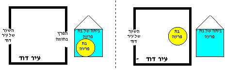 לדעתי ביתה של בת-פרעה היה מחוץ לעיר דוד, והוא לא היה בדיוק ליד השער של עיר דוד, כמו שרואים בתרשים הימני: