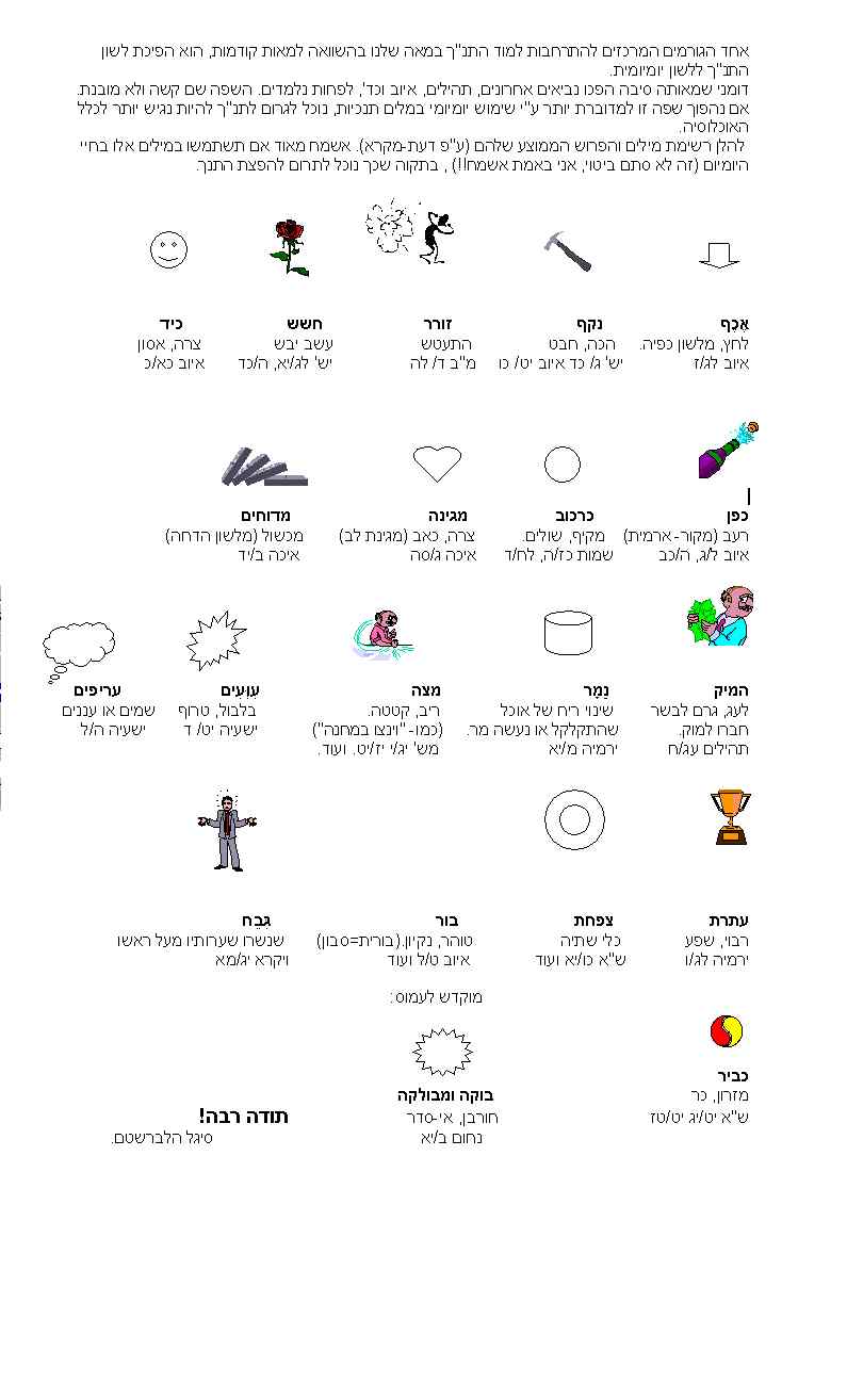 בדף זה יש מאמרים שמטרתם לחקור את המשמעות המדוייקת של מילים בלשון המקרא. ניתן למצוא הגדרות נוספות למושגים בלשון המקרא