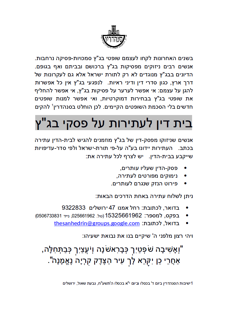 בשנים האחרונות לקחו לעצמם שופטי בג"ץ סמכויות-פסיקה נרחבות. אנשים רבים ניזוקים מפסיקות בג"ץ ברכושם ובביתם ואף בגופם. הדיונים בבג"ץ מנוגדים לא רק לתורת ישראל אלא גם לעקרונות של דרך ארץ, כגון סדרי דין ודיני ראיות. לנפגעי בג"ץ אין כל אפשרות להגן על עצמם: אי אפשר לערער על פסיקות בג"ץ, אי אפשר להחליף את שופטי בג"ץ בבחירות דמוקרטיות, ואי אפשר למנות שופטים חדשים בלי הסכמת השופטים הקיימים. לכן הוחלט בסנהדרין להקים בית דין לעתירות על פסקי בג"ץאנשים שניזוקו מפסק-דין של בג"ץ מוזמנים להגיש לבית-הדין עתירה בכתב. העתירות יידונו בע"ה על-פי תורת-ישראל ולפי סדר-עדיפויות שייקבע בבית-הדין. יש לצרף לכל עתירה את: